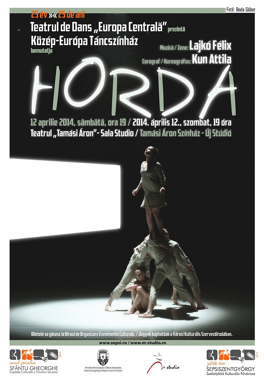 La invitaţia Primăriei Municipiului Sfântu Gheorghe, şi a Teatrului de Mişcare Studio M, soseşte în oraşul nostru Trupa Teatrului de Dans „Europa Centrală”. Spectacolul „HOARDA”, realizat în colaborare cu Kun Attila, pe muzica lui Lajkó Félix, va putea fi urmărit sâmbătă, 12 aprilie, de la ora 19,00, în Sala Studio.